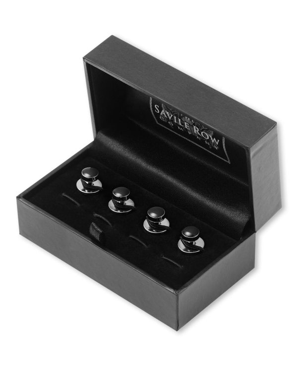 Elevate your formal attire with this pack of four onyx stone dress studs, a quintessential accessory for the discerning gentleman. Each stud features a sleek black onyx stone set in a rhodium-plated brass frame, adding a touch of understated elegance and sophistication to your dress shirt. The deep, lustrous hue of the onyx pairs seamlessly with any tuxedo or dress shirt, making these studs a versatile choice for both black-tie events and special occasions.