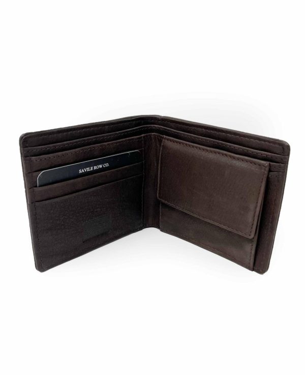 Brown leather billfold wallet, featuring three card slots, two cash sleeves, one receipt pouch and an integrated coin pouch with a press-stud closure. The convenient coin pouch within this wallet makes it a practical solution for managing that loose change.