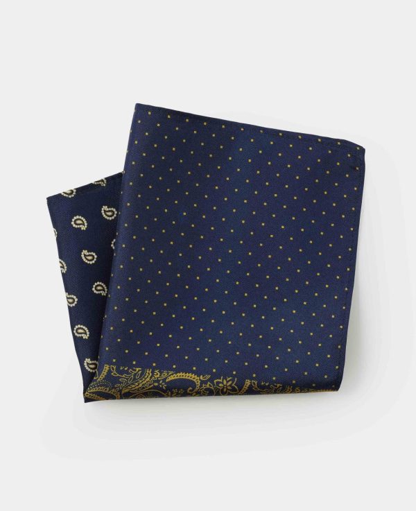 Elevate your style with our navy and gold 4-in-1 pocket square. Featuring two bold paisley prints, a solid navy and a refined dotted section, it’s pure silk luxury with four ways to wear. Perfect for adding a versatile, sophisticated touch to any blazer.