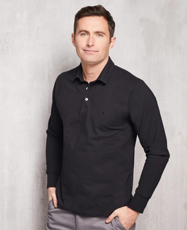 Our classic polo shirt with long sleeves. Made from black pique cotton with branding at the chest. The perfect smart-casual choice.