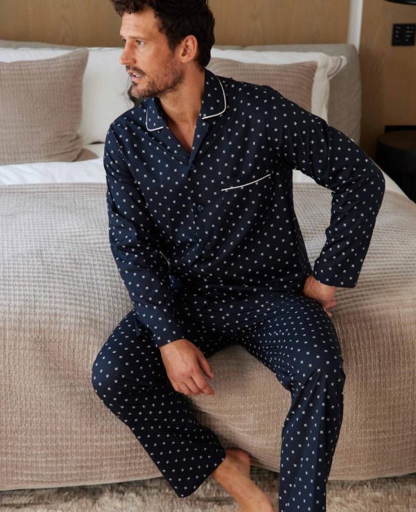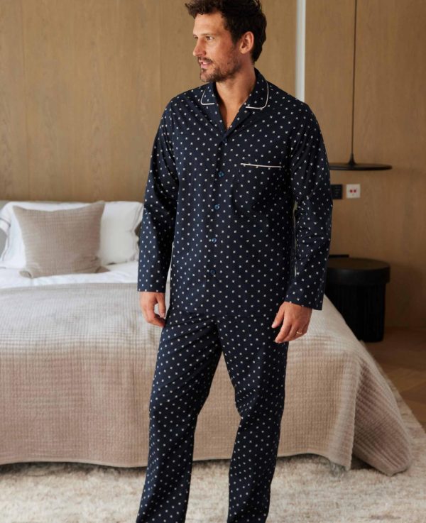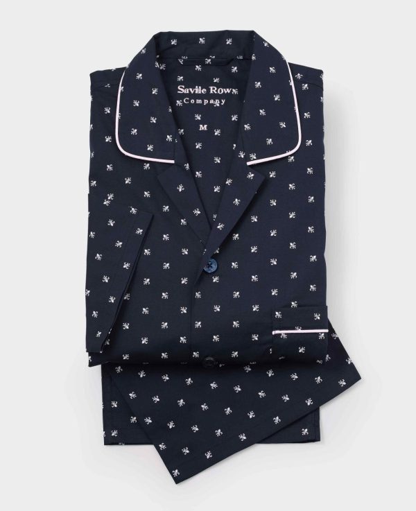 Elevate your sleepwear with our men’s pyjamas, featuring elegant piping along the collar for a refined, tailored look. Made from luxuriously soft cotton, they deliver unmatched comfort, ensuring a restful night’s sleep or a relaxing evening at home. The navy fabric, accented with a sophisticated fleur-de-lys pattern, exudes timeless style, while the contrasting piping adds a subtle yet classy detail. For a truly personal touch, customise your set with monogrammed initials, making these pyjamas a thoughtful gift or a luxurious addition to your wardrobe.