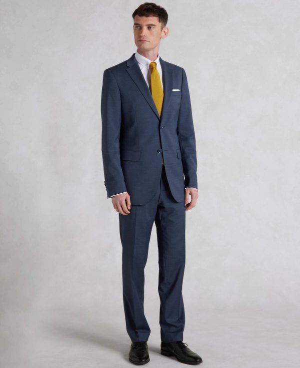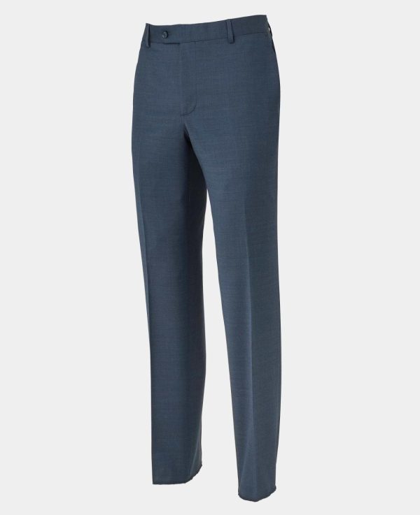 Dark blue flat front suit trousers with a straight leg. Crafted from a wool-blend fabric that has a hint of stretch for comfort. To ensure the best fit, alterations can be made to the inside leg, as well as tapering from the knee.
